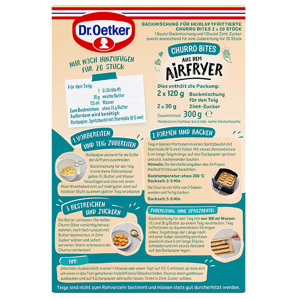 Die Dr. Oetker Churro Bites aus dem Airfryer bringen zimtig-süßen Jahrmarktgenuss direkt in die eigene Küche. Aus den zwei beiliegenden Beuteln entstehen insgesamt 40 kleine Churro Bites, die im Airfryer außen knusprig aufbacken und innen angenehm weich bleiben. Der beigefügte Zimt-Zucker sorgt für die typische süße Note, die an Kirmes und Weihnachtsmarkt erinnert.