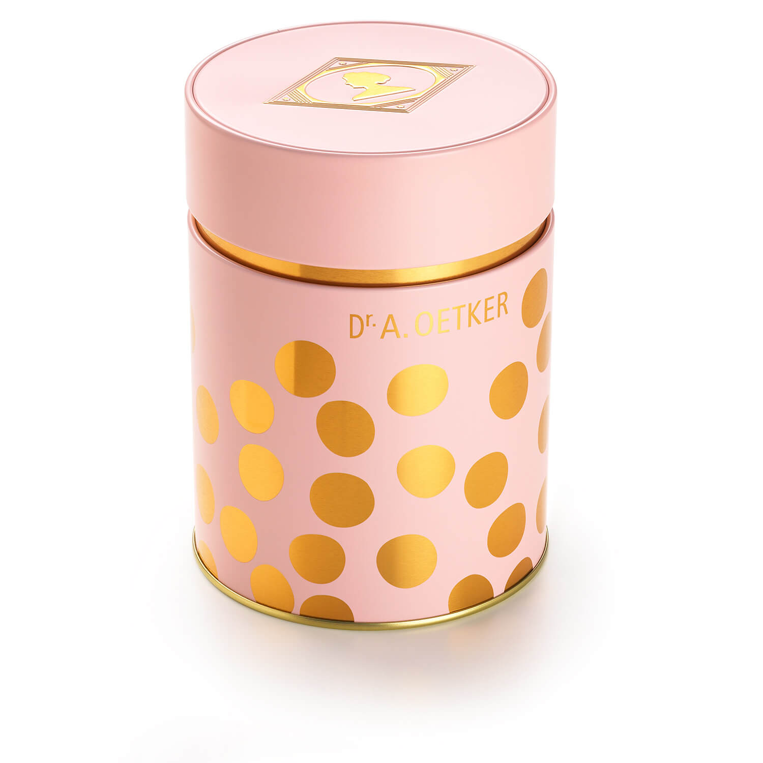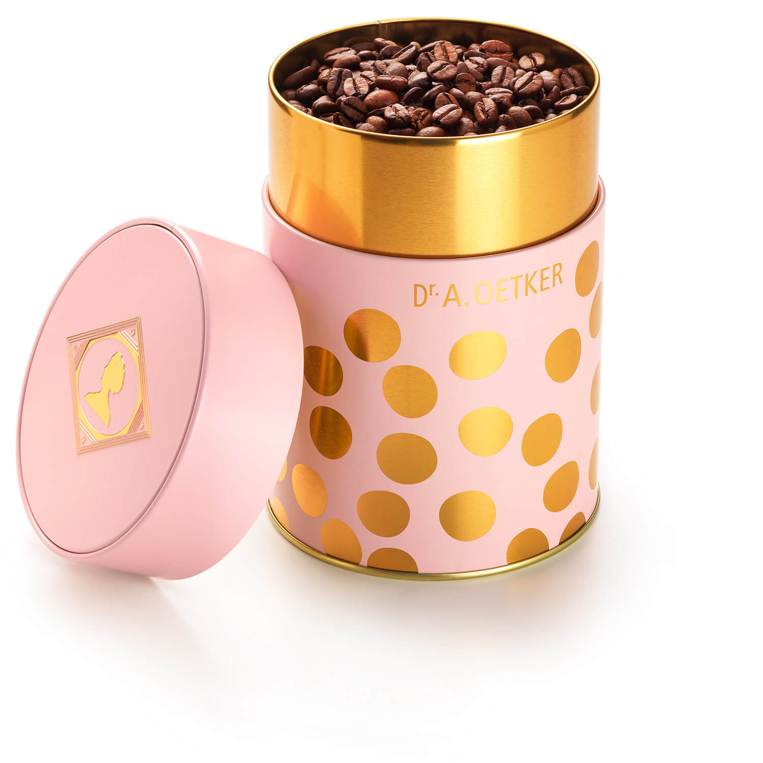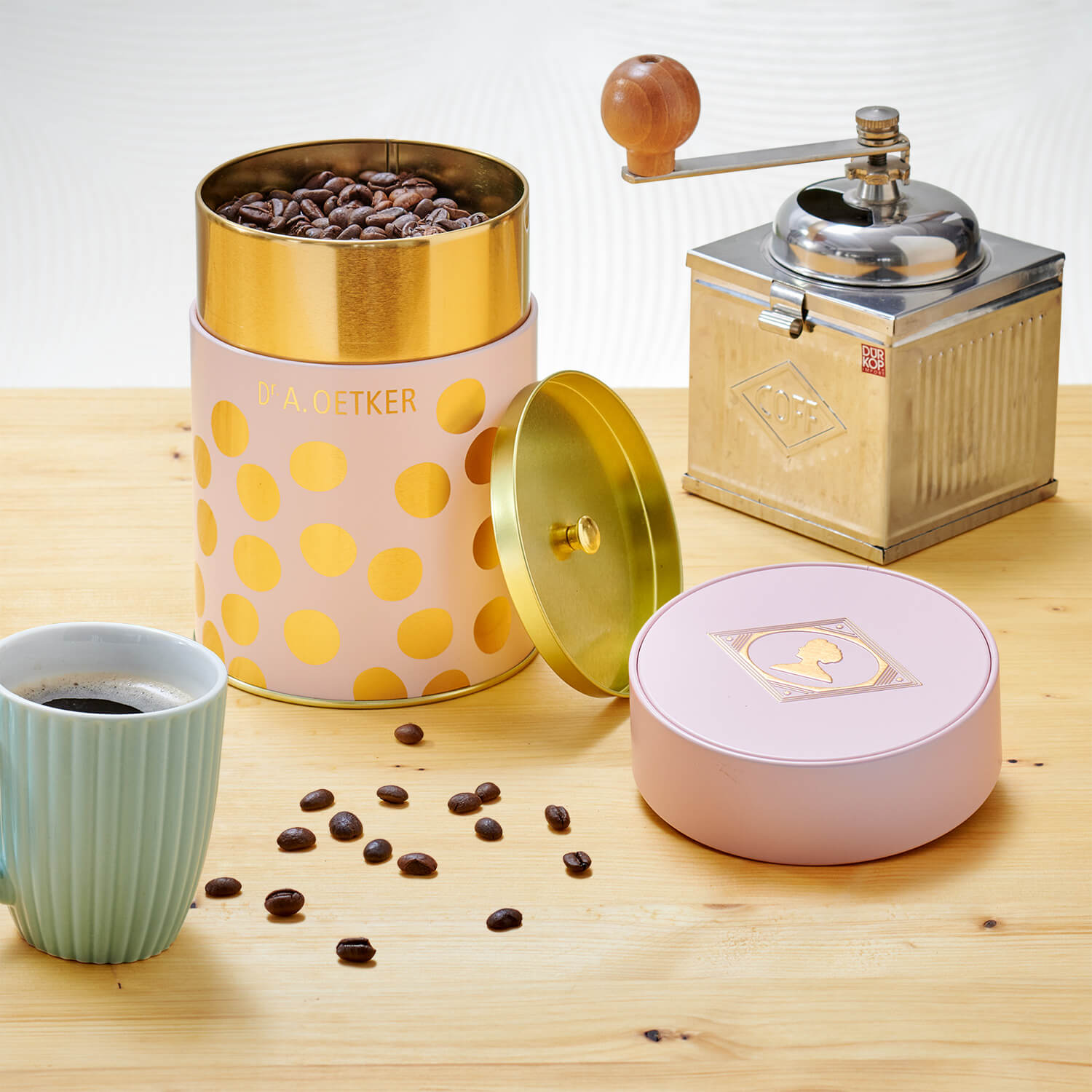 Diese Aromadose "puder-gold", mit ihrem modernen Design in einem matten Puderton mit goldfarbenen Punkten, ist perfekt geeignet, um den Kaffee, Tee oder andere Lebensmittel optimal zu lagern. Durch den farblich passenden Innendeckel, ist der Inhalt aromageschützt und bleibt damit lange frisch. Erstmalig wurde das eckige Dr. Oetker Logo aufgegriffen, das mit seiner Prägung und den goldfarbenen Details auf der Dose für ein optisches Highlight in der Küche sorgt. Die Dose kann 500g Kaffeebohnen oder 600g Kaffeepulver stylisch und trendy aufbewahren.