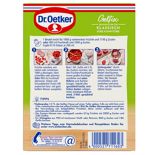 Mit Dr. Oetker Gelfix Klassisch 1:1 kannst du deine klassisch-süßen Lieblingskonfitüren, -marmeladen und -gelees herstellen.