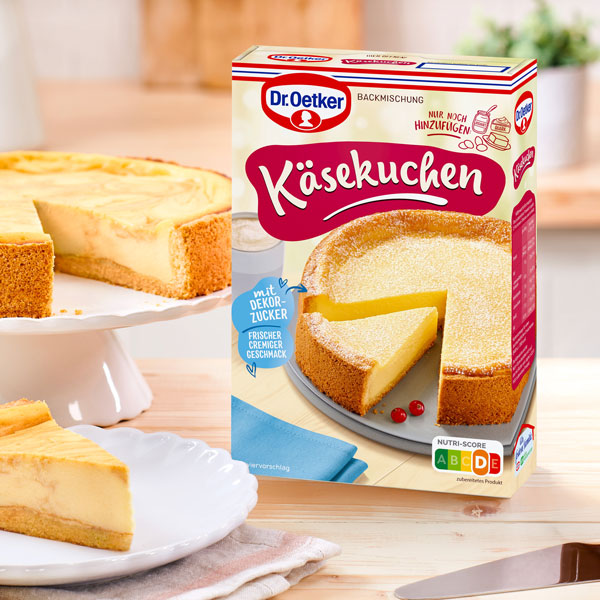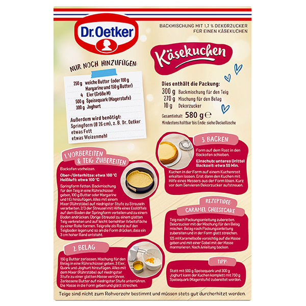 Mit Hilfe der Mischung für den Teig und der Belagmischung lässt sich ein saftiger Käsekuchengenuss backen, der herrlich frisch und locker schmeckt und immer wieder neu begeistert. Ein goldener Genuss für Familie und Freunde!Dank der bewährten Rezeptur und der einfachen und gelingsicheren Zubereitungsanleitung auf der Verpackungsrückseite lässt sich ganz unkompliziert ein echtes Highlight für jede Kaffeetafel zaubern.Für die Zubereitung werden 500g Speisequark, 300g Joghurt, 250 g weiche Margarine oder Butter und 4 Eier sowie etwas Weizenmehl benötigt. Nur noch etwa 55 Minuten backen und fertig ist der köstliche, traditionelle Käsekuchen!