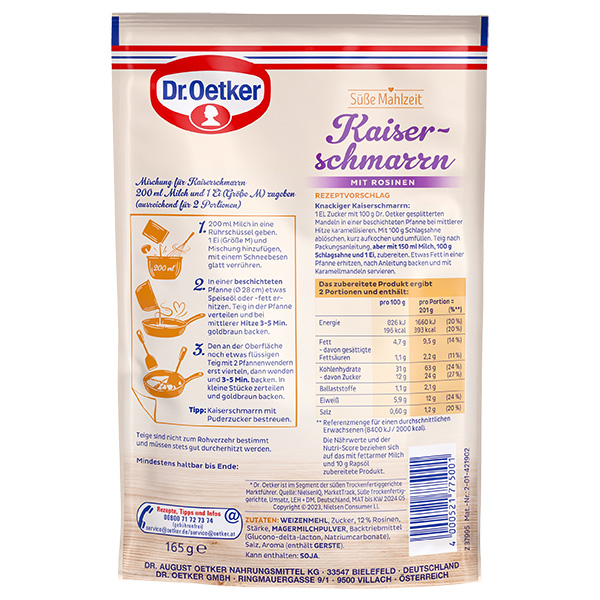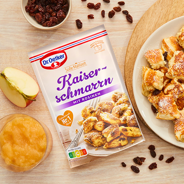 Er gelingt garantiert und ist schnell und einfach zubereitet. Die Mischung nur in 150 ml Milch einrühren und ein Ei hinzufügen, dann in der Pfanne ausbacken. In nur 10 Minuten ist der leckere Kaiserschmarrn von Dr. Oetker Süße Mahlzeit fertig. Serviere ihn mit Puderzucker bestäubt oder mit Dr. Oetker Fruchtgrützen aus dem Kühlregal. Ob als Hauptmahlzeit oder für Zwischendurch: Dr. Oetker Süße Mahlzeit schmeckt so gut wie selbst gemacht.