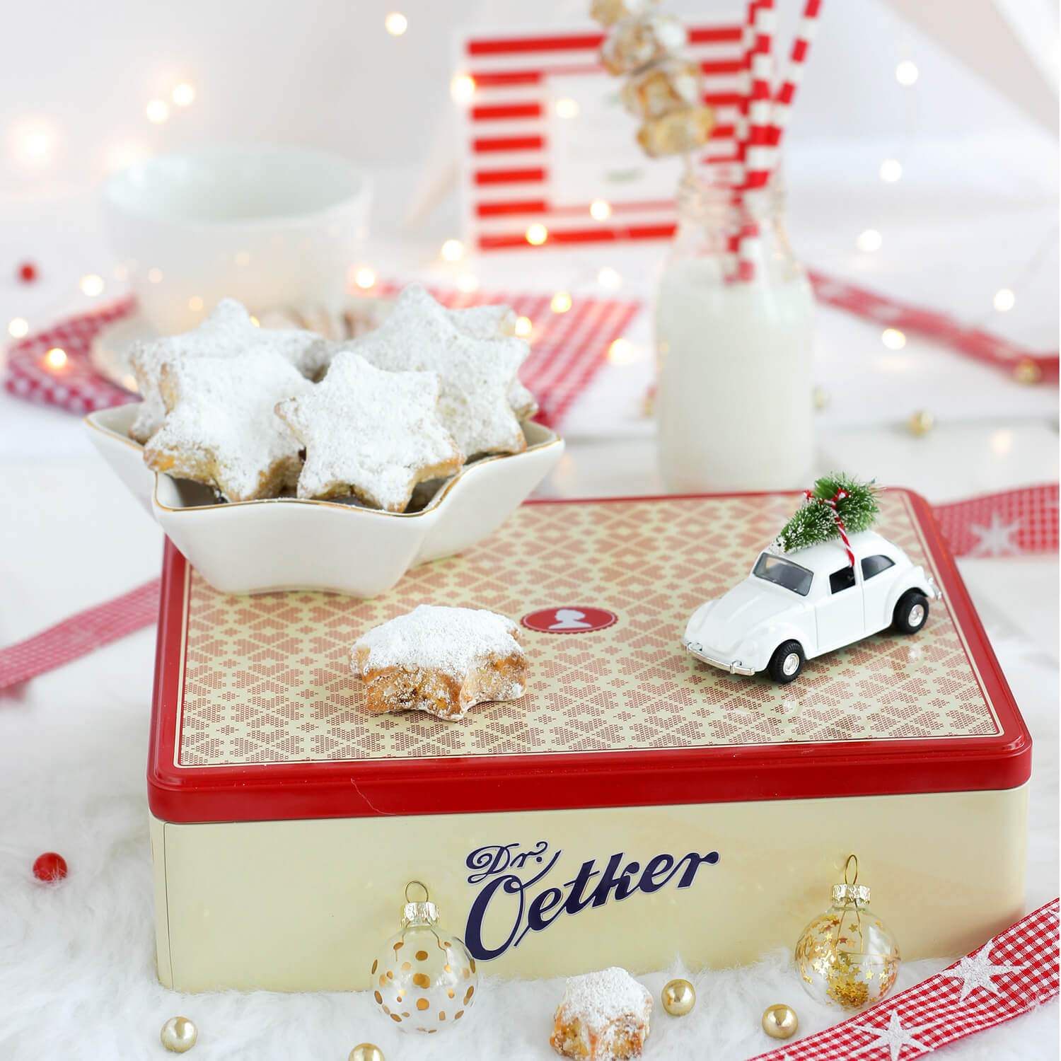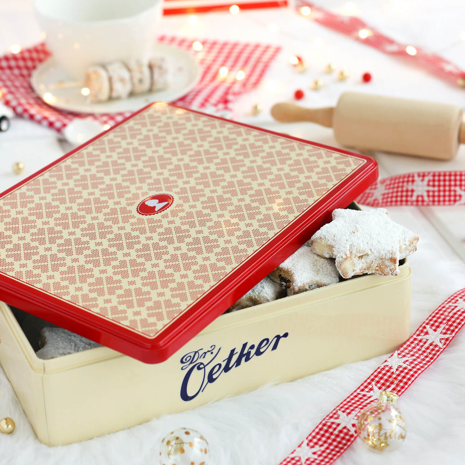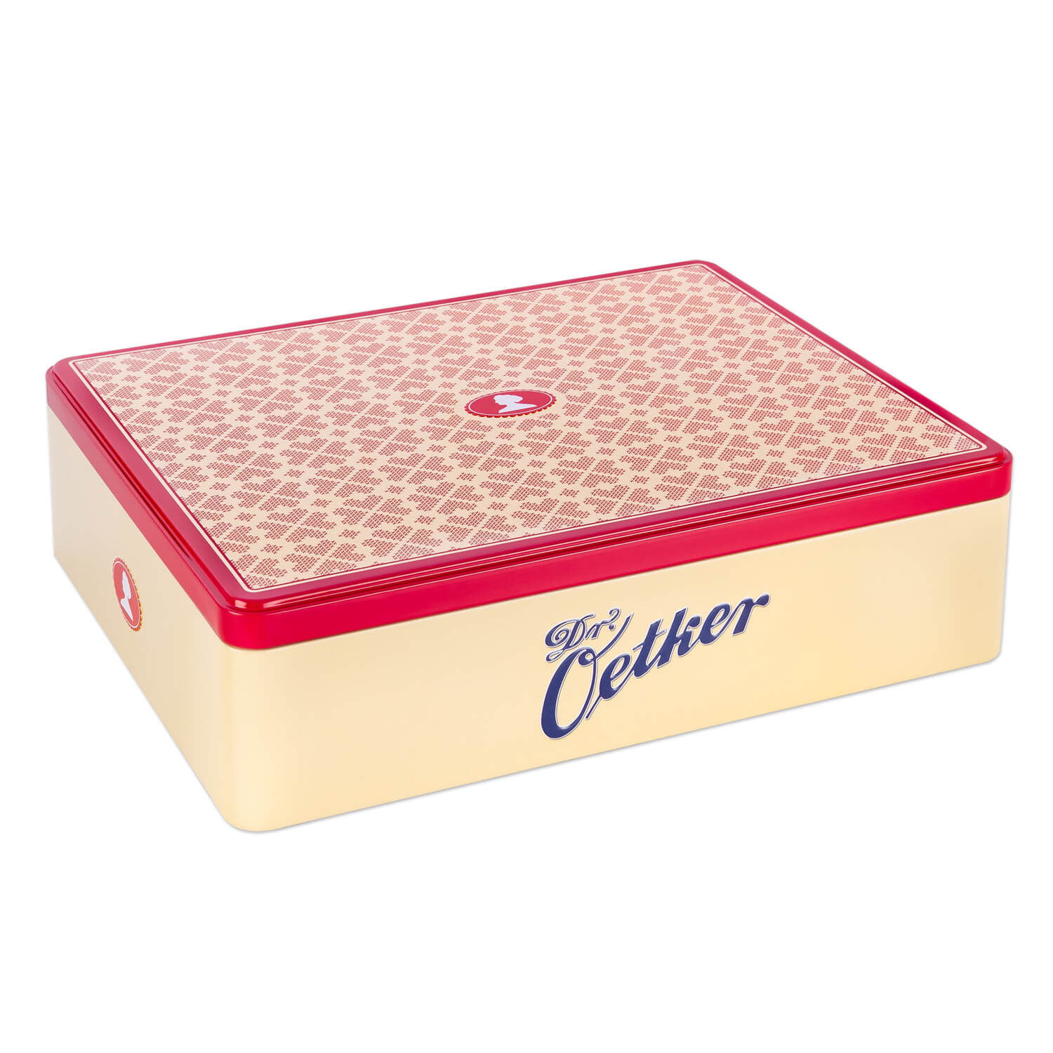 Diese Keksdose mit ihrem Design, das an Stickereien erinnert, ist perfekt geeignet, um Dr. Oetker Backzutaten darin sicher und geschützt aufzubewahren. Selbst gebackene Kekse und Plätzchen oder Kleingebäck bleiben darin lange frisch. Oder Sie verwenden diese Dose, um persönliche Gegenstände, wie Postkarten oder Bilder, darin aufzubewahren.