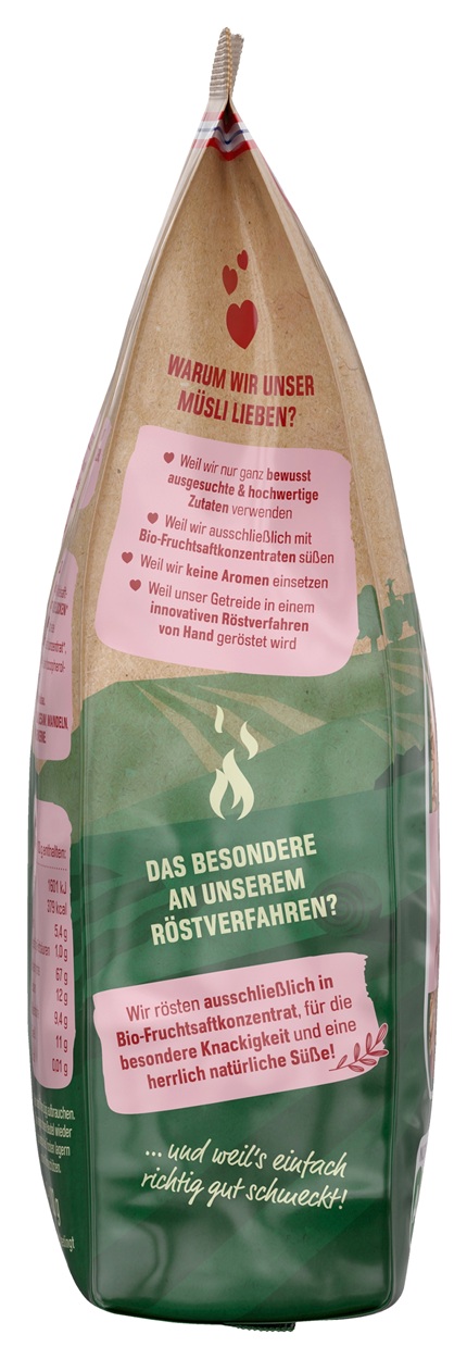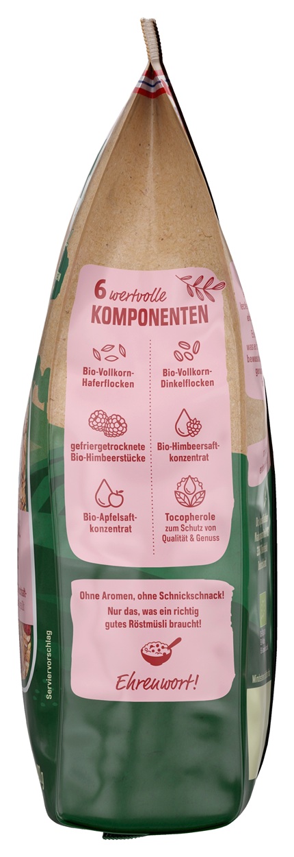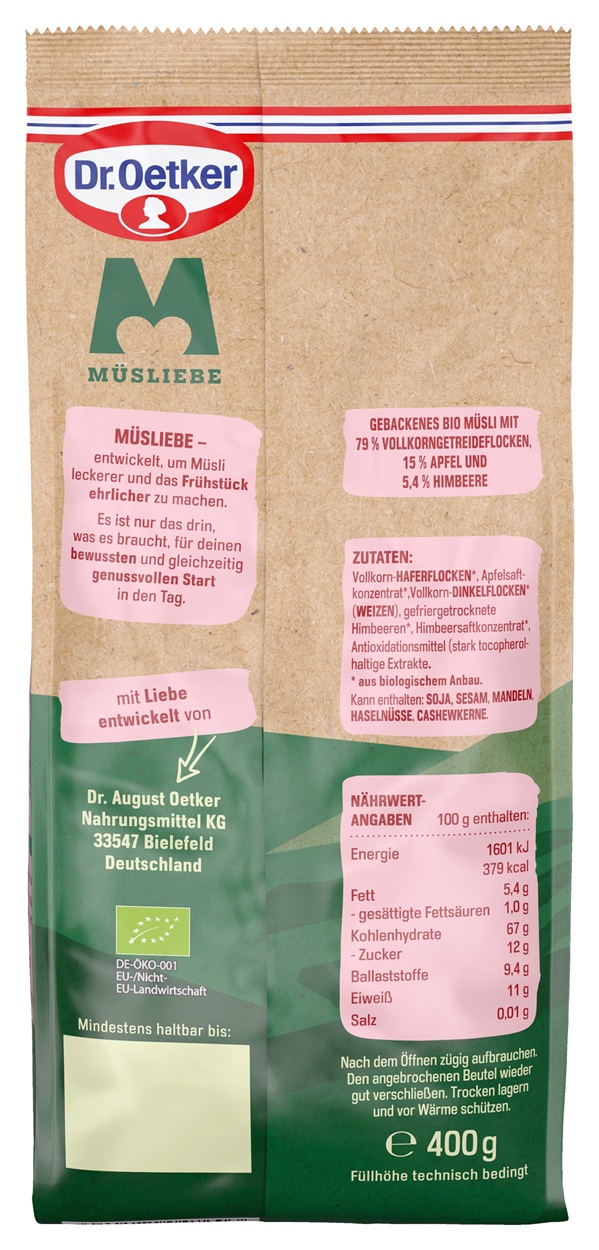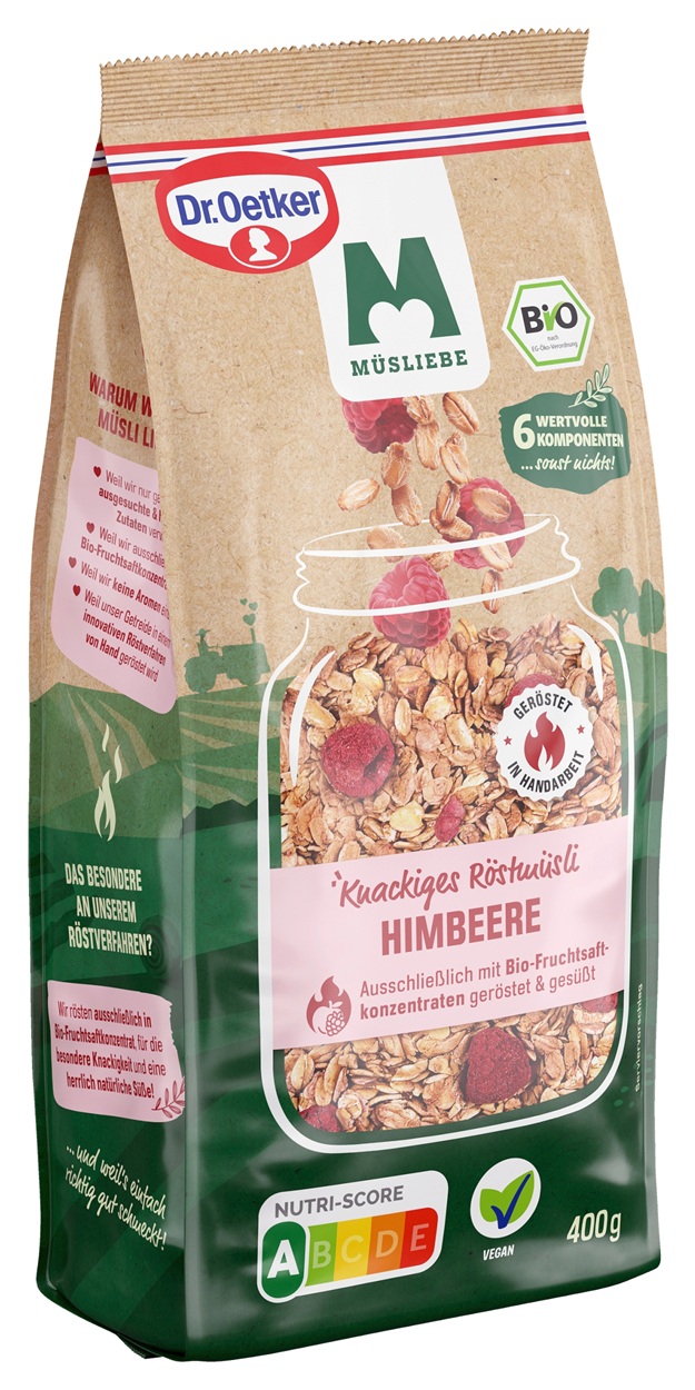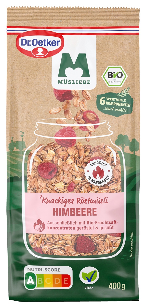Mit dem Dr. Oetker MÜSLIEBE Bio Müsli Himbeere startet der Tag voller köstlicher Genussmomente. Das nur mit Himbeersaft- und Apfelsaftkonzentrat gesüßte Müsli aus Vollkorn-Hafer- und Dinkelflocken kombiniert mit gefriergetrockneten Himbeeren sorgt für ein ausgewogenes Zusammenspiel aus süßem Fruchtaroma und angenehmem Crunch. Dank des besonderen Röstverfahrens, das die Flocken schonend knusprig macht, bleibt ihr natürlicher Geschmack erhalten.