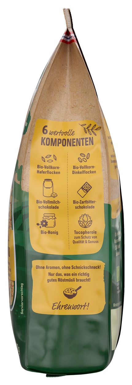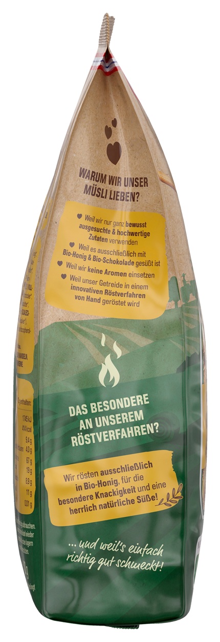 Mit Milch, Joghurt oder pur genossen: das Honig & Schoko ist vielseitig und macht jeden Löffel zu einem kleinen Genussmoment. Für alle, die ihren Tag mit Bio, Geschmack und hochwertigen Zutaten beginnen möchten – oder zwischendurch Lust auf leckeren Müsligenuss haben.