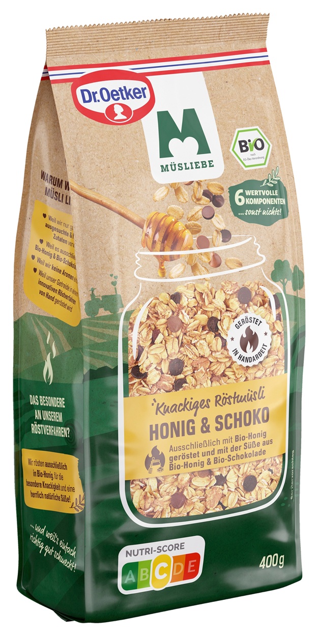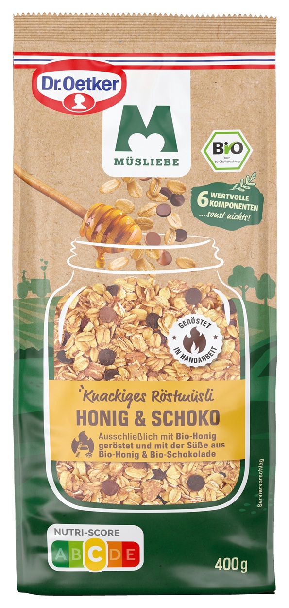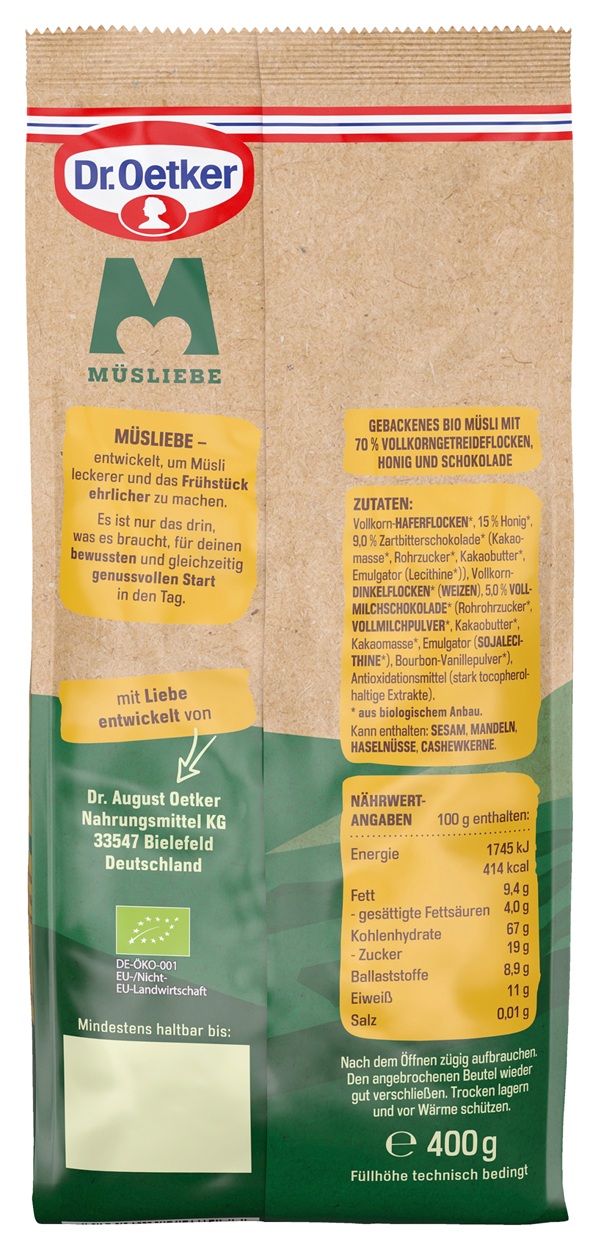 Das Dr. Oetker MÜSLIEBE Bio Müsli Honig & Schoko bringt hochwertigen Genuss in die morgendliche Müslischale. Das Müsli besteht aus Vollkorn-Hafer- und Dinkelflocken kombiniert mit Vollmilch- und Zartbitter-Schokolade. So entsteht eine stimmige Verbindung aus süßem Honigaroma und angenehmem Crunch.