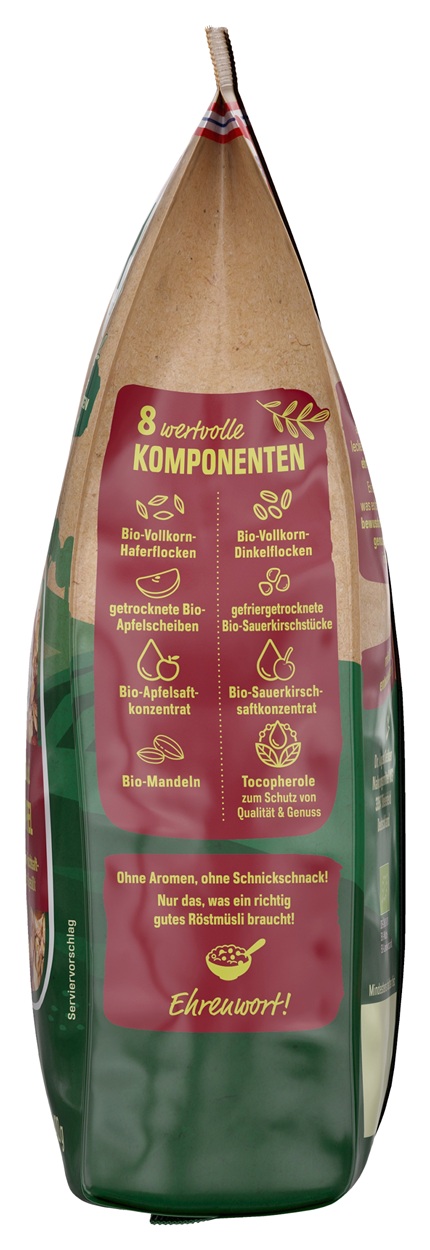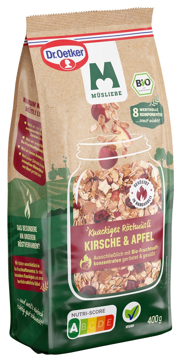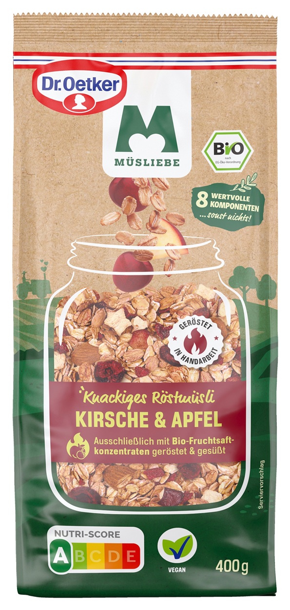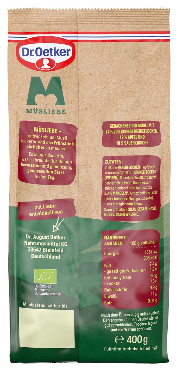 Das Dr. Oetker MÜSLIEBE Bio Müsli Kirsche & Apfel bringt ausgewählten Genuss in die Müslischale. Das nur mit Sauerkirschsaft- und Apfelsaftkonzentrat gesüßte Müsli aus Vollkorn-Hafer- und Dinkelflocken kombiniert mit Mandeln und getrockneten Kirschen und Äpfeln sorgt für ein ausgewogenes Zusammenspiel aus süßem Fruchtaroma und angenehmem Crunch. Dank des besonderen Röstverfahrens, das die Flocken schonend knusprig macht, bleibt ihr natürlicher Geschmack erhalten.