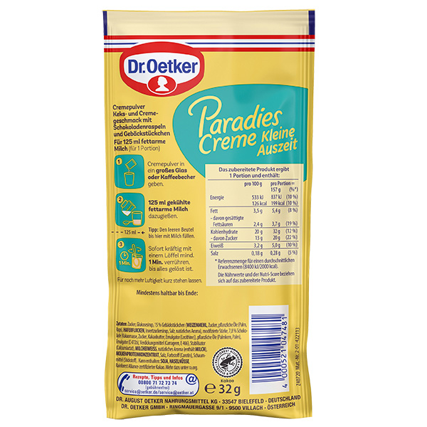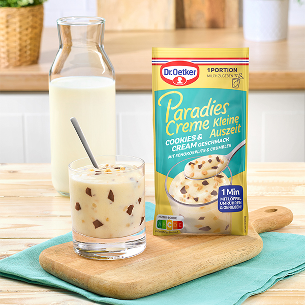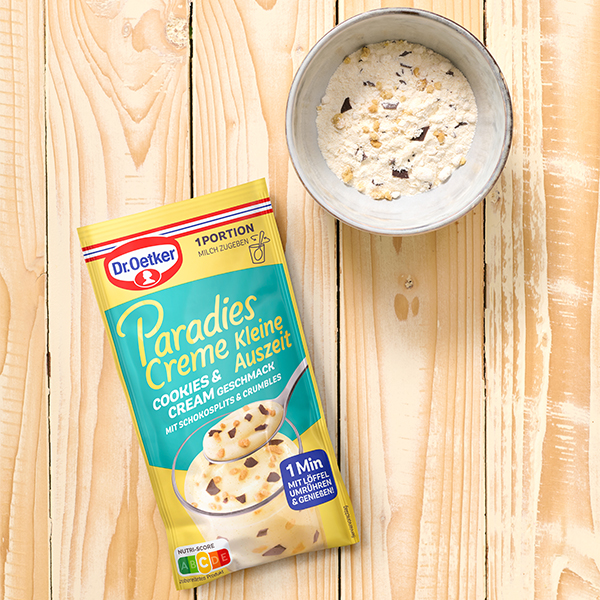 Die Dr. Oetker Paradies Creme Kleine Auszeit Cookies & Cream-Geschmack in der Einzelportion verwöhnt mit Keks & Cream-Geschmack , Schokosplits und Crumbles – ein lockerer Genuss für zwischendurch.