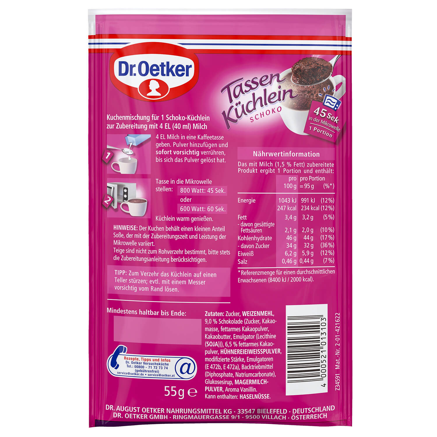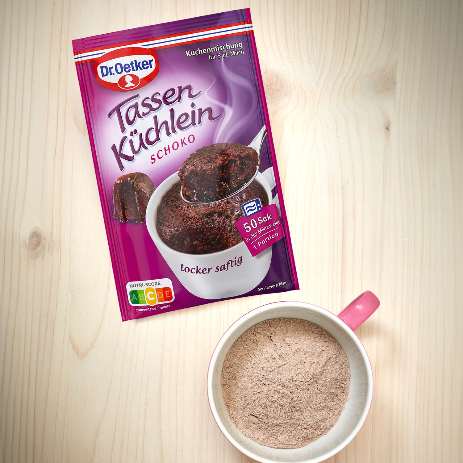 Das Tassen Küchlein Schoko ist rasant zubereitet und ist genau das richtige für den süßen Hunger zwischendurch. Einfach mit Milch in einer Tasse angerührt, 45 Sekunden in der Mikrowelle gebacken und fertig ist die schokoladige Kuchenportion. Herrlich saftig und intensiv im Geschmack, so warm und frisch wie im Ofen zubereitet und zum sofortigen Genuss bereit!Tipp: Einfach den kleinen Kuchen auf einen kleinen Teller stürzen und sich über ein raffiniertes Küchlein mit leckerer Soße freuen.