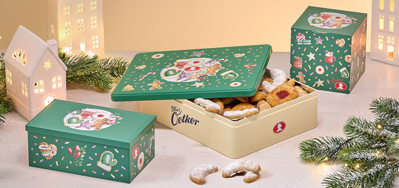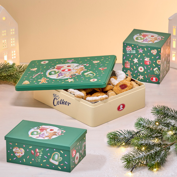 Weihnachtlich gestaltete Aufbewahrungsdosen von Dr. Oetker eignen hervorragend für die Lagerung und Präsentation der eigenen Keks-Produktion. Auch als Geschenk eignen sich die Dosen hervorragend, besonders wenn sie bereits mit einer Auswahl unserer festlichsten Produkte kommen. Klick dich durch unsere schönsten Geschenk- und Probier-Sets.
