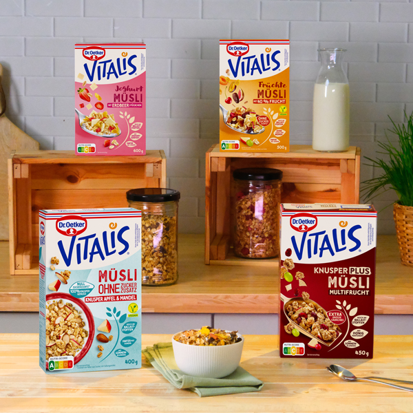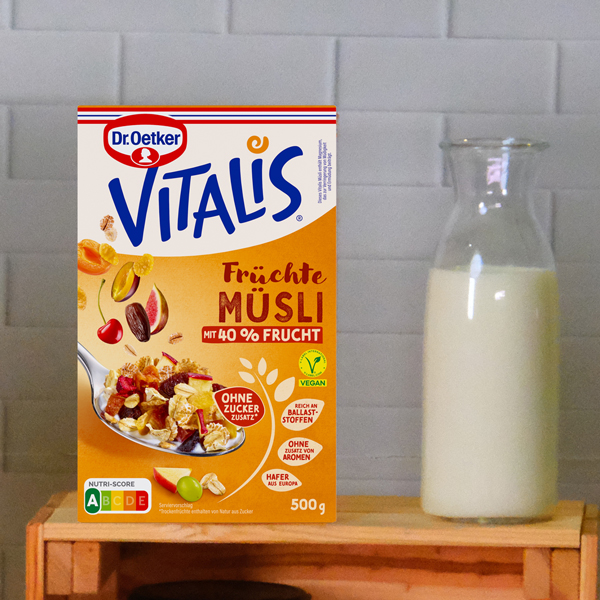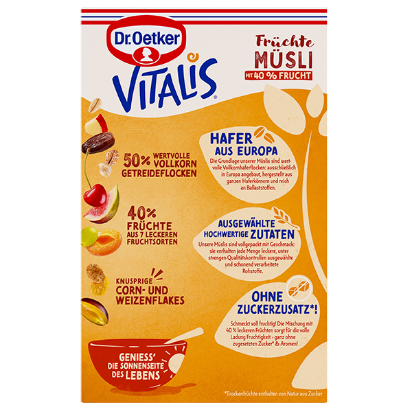 Das Vitalis Früchtemüsli bietet mit 40% Fruchtanteil unseren besonders fruchtigen Müsligenuss! Kernige Vollkorn-Getreideflocken aus Hafer, Weizen und Gerste sind mit sieben verschiedenen Fruchtsorten besonders lecker kombiniert. Ohne Zusatz von Aromen. Reich an hochwertigen Ballaststoffen. Mit Eisen und Magnesium. Vitalis – Genuss, der gut tut.
