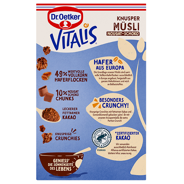 Vom Brötchen in die Müslischale: Mit dem Vitalis Knuspermüsli Nougat-Schoko lässt sich der beliebte Geschmack des Frühstücksklassikers Nuss-Nougat-Creme jetzt auch im Müsli knuspern. Die knackigen Crunchies mit schokoladig-nussigem Geschmack, kombiniert mit zarten Nougat-Schoko-Chunks, sorgen für ein besonderes Knuspererlebnis am Morgen. Im Vitalis Knuspermüsli Nougat-Schoko verbinden sich 50% wertvolle Vollkornhaferflocken, 10% zartschmelzende Nougat-Schoko-Chunks und 3,7% feiner Rainforest-Alliance-zertifizierter Kakao zu einem knusprigen Frühstücksgenuss in beliebter Geschmacksrichtung.