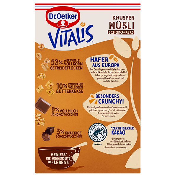 Vitalis Knuspermüsli Schoko + Keks bietet den doppelten Knuspergenuss: Leckere Knusper Crunchies in Kombination mit knackigen Vollkornbutterkeksen und zwei Sorten Schokolade sorgen für das besondere Genusserlebnis - nicht nur morgens. Für das Müsli wird ausschließlich Rainforest-Alliance-zertifizierter Kakao verwendet.