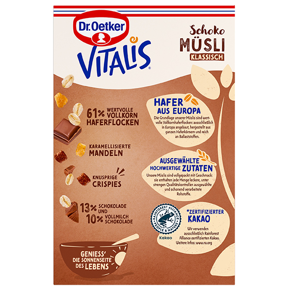 Viel echte Vollmilch Schokolade macht Vitalis Schokomüsli klassisch zu einem köstlichen Genuss. Denn die Schokostückchen aus fein abgestimmter Vollmilch- und Zartbitterschokolade sind herrlich zart und schoko-lecker. Mit vielen zarten Haferflocken, reichlich Pops und Mandeln wird Vitalis Schokomüsli klassisch zum unverwechselbaren Schokogenuss.
